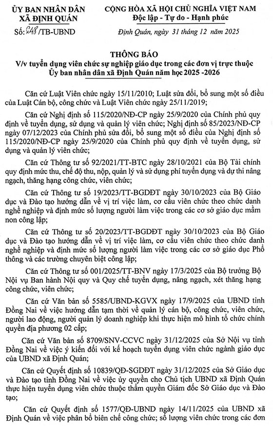 UBND xã Định Quán thông báo tuyển dụng viên chức sự nghiệp giáo dục trong các đơn vị trực thuộc Ủy ban nhân dân xã Định Quán năm 2025 như sau: