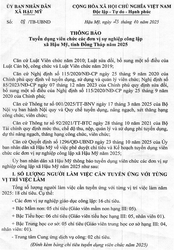 Ủy ban nhân dân xã Hậu Mỹ thông báo tuyển dụng viên chức các đơn vị sự nghiệp công lập xã Hậu Mỹ năm 2025 như sau: