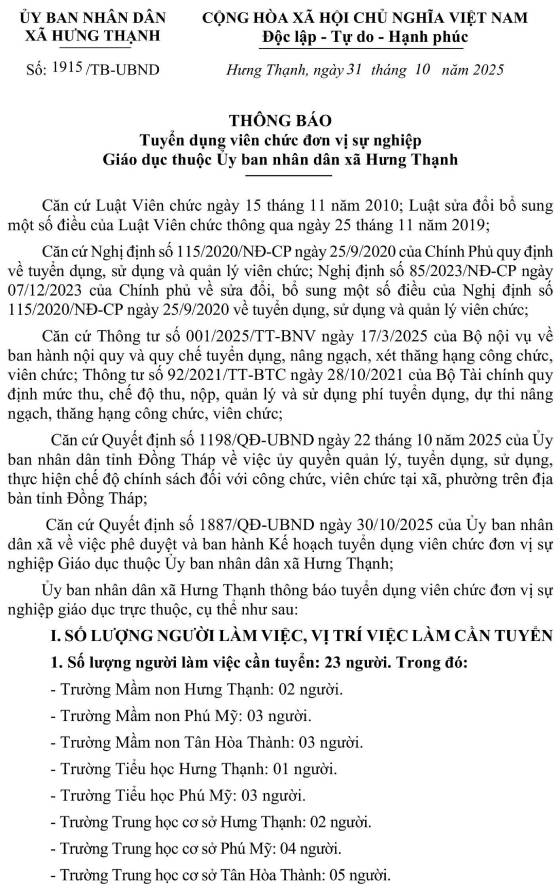 Ủy ban nhân dân xã Hưng Thạnh thông báo tuyển dụng viên chức đơn vị sự nghiệp giáo dục trực thuộc, cụ thể như sau: