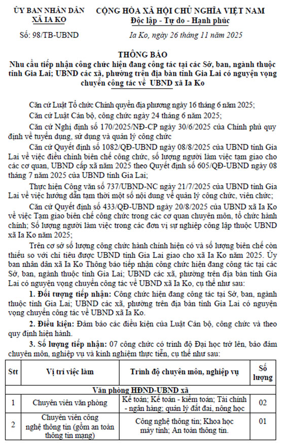 Ủy ban nhân dân xã la Ko Thông báo tiếp nhận công chức hiện đang công tác tại các Sở, ban, ngành thuộc tỉnh Gia Lai; UBND các xã, phường trên địa bàn tỉnh Gia Lai có nguyện vọng chuyển công tác về UBND xã la Ko, cụ thể như sau: