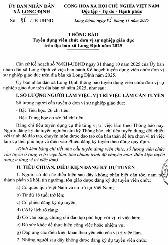 Ủy ban nhân dân xã Long Định thông báo tuyển dụng viên chức đơn vị sự nghiệp giáo dục trên địa bàn xã năm 2025, như sau: