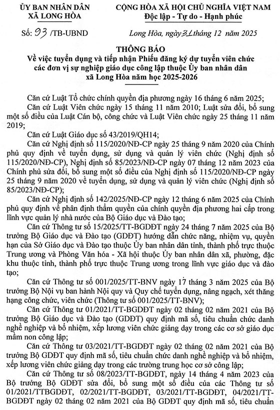 Ủy ban nhân dân xã Long Hòa thông báo tuyển dụng và tiếp nhận Phiếu đăng ký dự tuyển viên chức các đơn vị sự nghiệp giáo dục công lập thuộc Ủy ban nhân dân xã Long Hòa, năm học 2025-2026, cụ thể như sau: