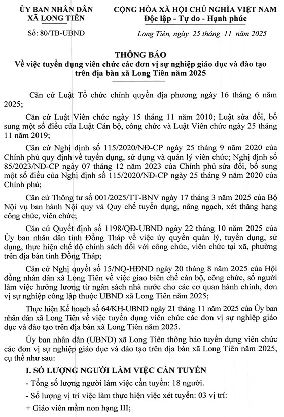 UBND xã Long Tiên, Đồng Tháp tuyển dụng viên chức sự nghiệp GD&ĐT năm 2025