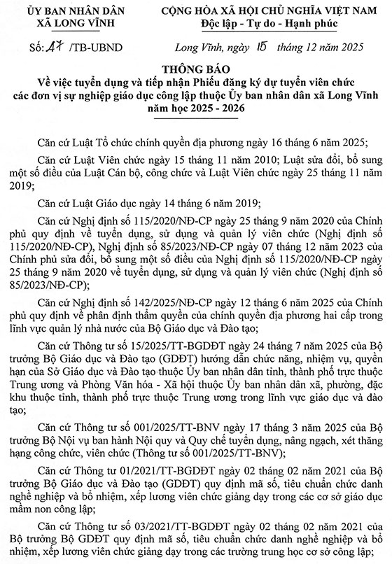 UBND xã Long Vĩnh thông báo tuyển dụng và tiếp nhận Phiếu đăng ký dự tuyển viên chức các đơn vị sự nghiệp giáo dục công lập thuộc UBND xã Long Vĩnh năm học 2025 – 2026, cụ thể như sau: