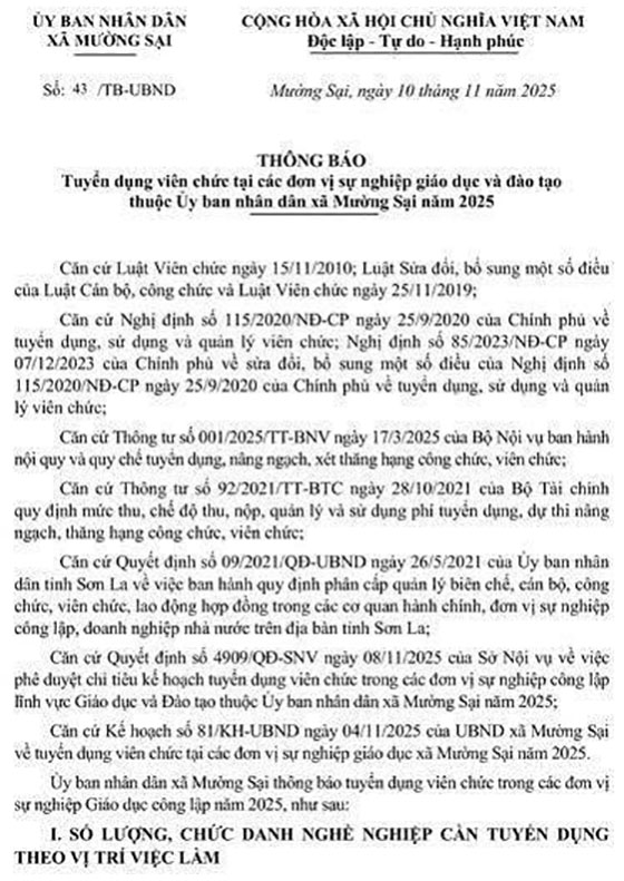 Ủy bạn nhân dân xã Mường Sại thông báo tuyển dụng viên chức trong các đơn vị sự nghiệp Giáo dục công lập năm 2025, như sau: