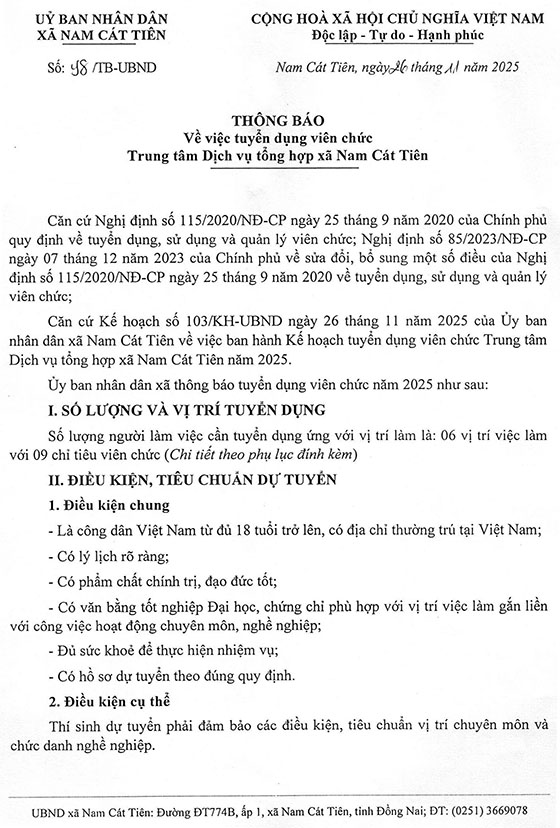 UBND xã Nam Cát Tiên thông báo tuyển dụng viên chức năm 2025 như sau: