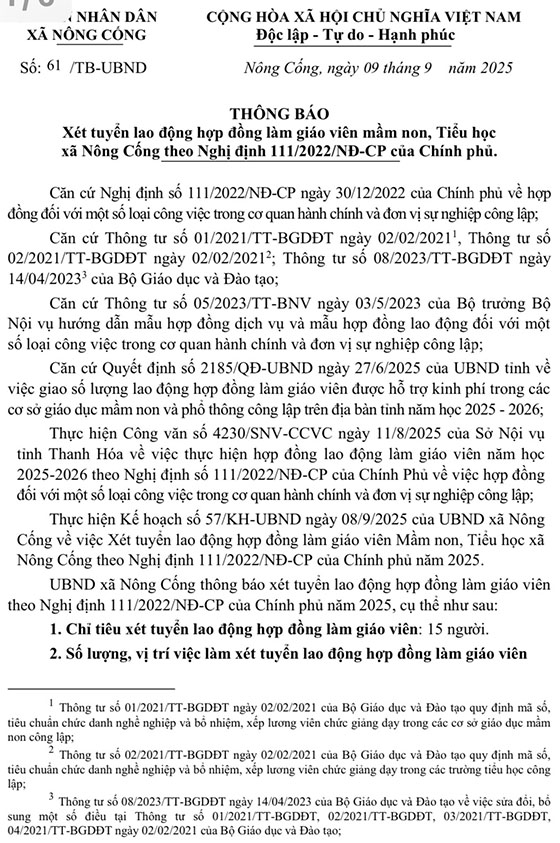 UBND xã Nông Cống thông báo xét tuyển lao động hợp đồng làm giáo viên, cụ thể như sau:
