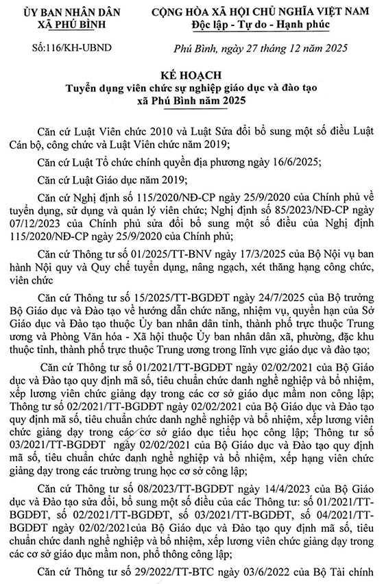 Thực hiện Công văn số 4602/SNV-CCVC ngày 27/12/2025 của Sở Nội vụ thống nhất một số nội dung về Kế hoạch tuyển dụng viên chức sự nghiệp giáo dục và đào tạo của UBND xã Phú Bình;