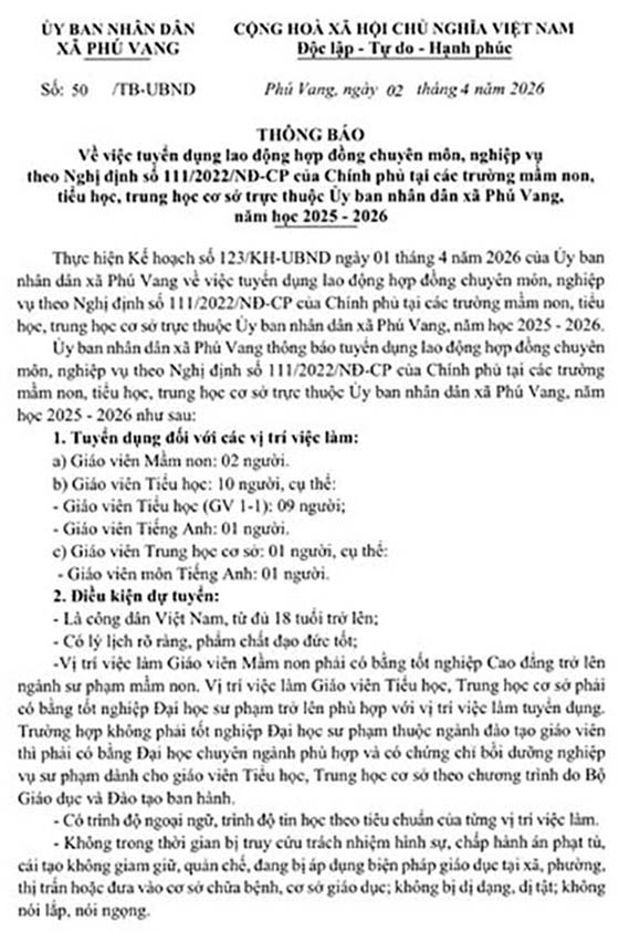 Ủy ban nhân dân xã Phú Vang thông báo tuyển dụng lao động hợp đồng chuyên môn, nghiệp vụ theo Nghị định số 111/2022/NĐ-CP của Chính phủ tại các trường mầm non, tiểu học, trung học cơ sở trực thuộc Ủy ban nhân dân xã Phú Vang, năm học 2025 – 2026 như sau: