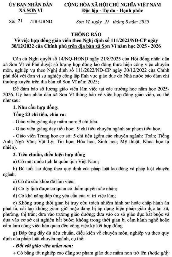 Để đảm bảo số lượng giáo viên làm việc tại các trường học năm học 2025- 2026. Uỷ ban nhân dân xã Sơn Vĩ thông báo về việc hợp đồng giáo viên, cụ thể như sau: