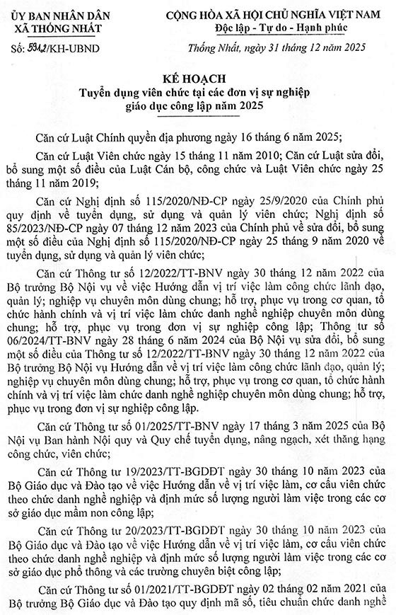 UBND xã ban hành Kế hoạch tuyển dụng viên chức tại các đơn vị sự nghiệp giáo dục công lập xã Thống Nhất năm 2025, cụ thể như sau: