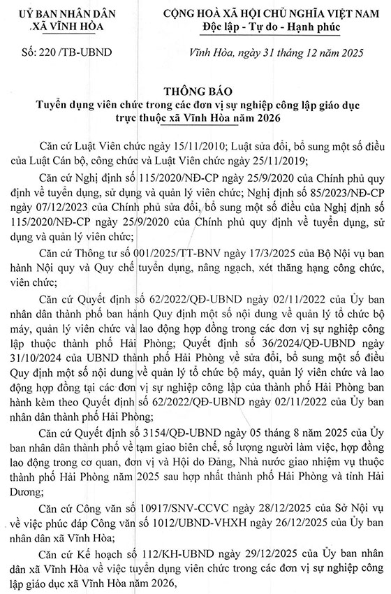 UBND xã Vĩnh Hòa, Hải Phòng tuyển dụng viên chức đơn vị sự nghiệp công lập giáo dục năm 2026