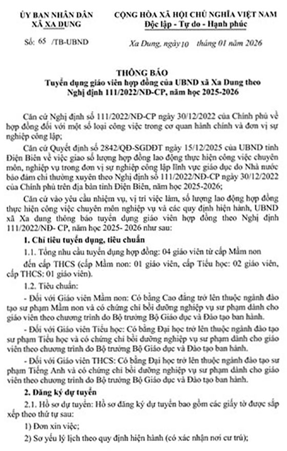 Căn cứ vào yêu cầu nhiệm vụ, vị trí việc làm, số lượng lao động hợp đồng thực hiện công việc chuyên môn nghiệp vụ và các quy định hiện hành, UBND xã Xa Dung thông báo tuyển dụng giáo viên hợp đồng theo Nghị định 111/2032/NĐ- CP, năm học 2025- 2026 như sau: