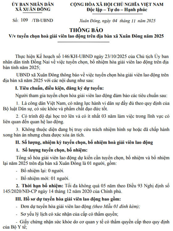 UBND xã Xuân Đông thông báo về việc tuyển chọn hòa giải viên lao động trên địa bàn xã năm 2025 với các nội dung như sau: