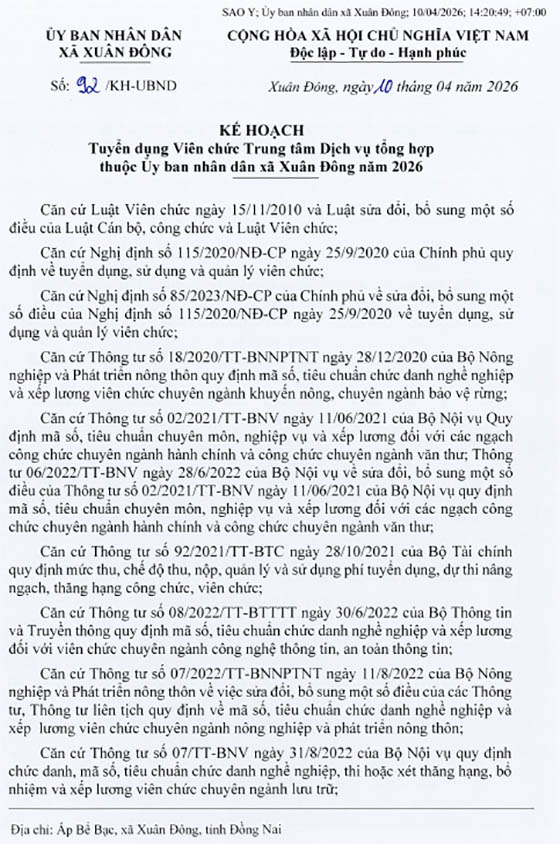 UBND xã Xuân Đông, Đồng Nai tuyển dụng viên chức năm 2026