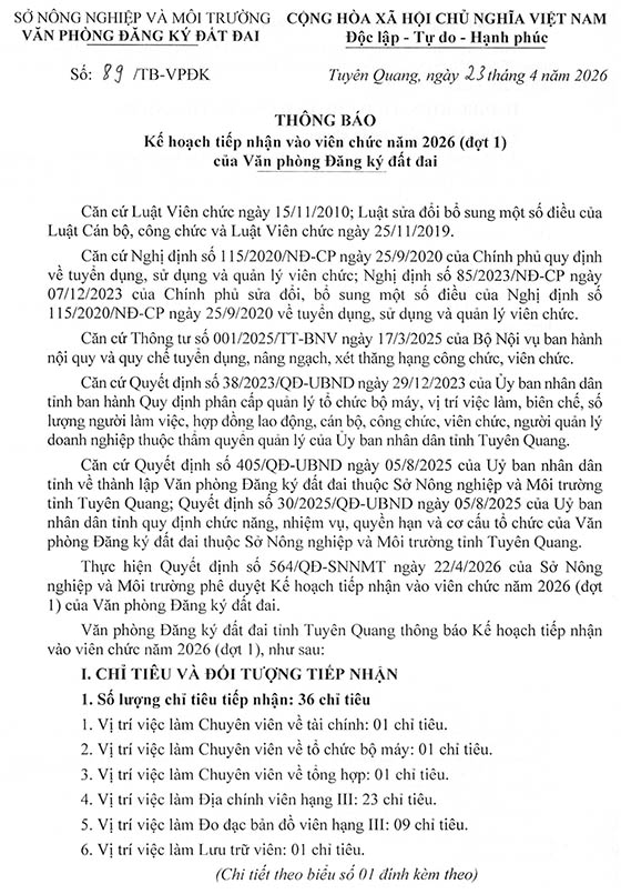 Văn phòng Đăng ký đất đai tỉnh Tuyên Quang thông báo Kế hoạch tiếp nhận vào viên chức năm 2026 (đợt 1), như sau: