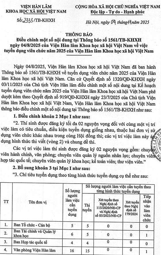 Viện Hàn lâm Khoa học xã hội Việt Nam thông báo điều chỉnh một số nội dung tại Thông báo số 1561/TB-KHXH và Quyết định số 919/QĐ-KHXH về tuyển dụng viên chức năm 2025 như sau: