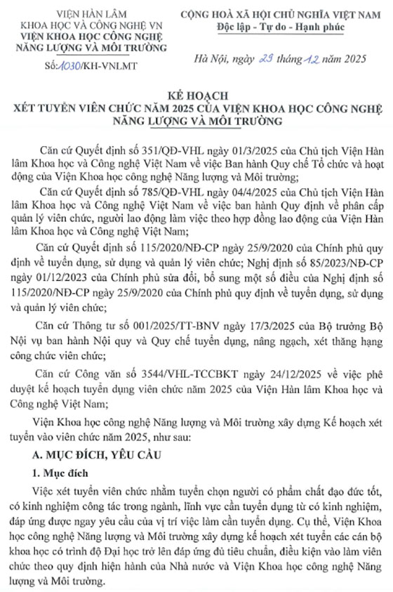 Viện Khoa học công nghệ Năng lượng và Môi trường tuyển dụng viên chức năm 2025