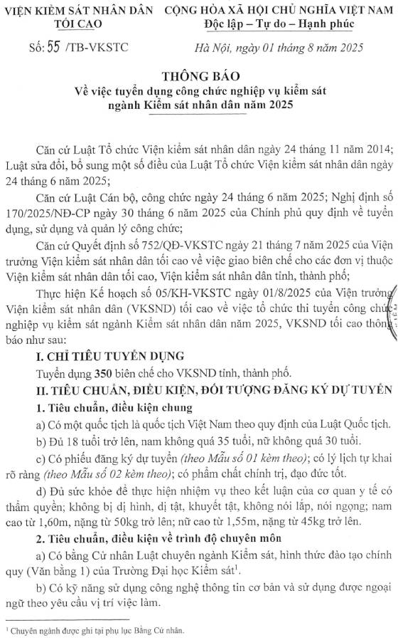 Thực hiện Kế hoạch số 05/KH-VKSTC ngày 01/8/2025 của Viện trưởng viện Kiểm soát nhân dân (VKSND) tối cao về việc tổ chức thi tuyển công chức nghiệp vụ kiểm sát ngành Kiểm sát nhân dân năm 2025, VKSND tối cao thông báo như sau: