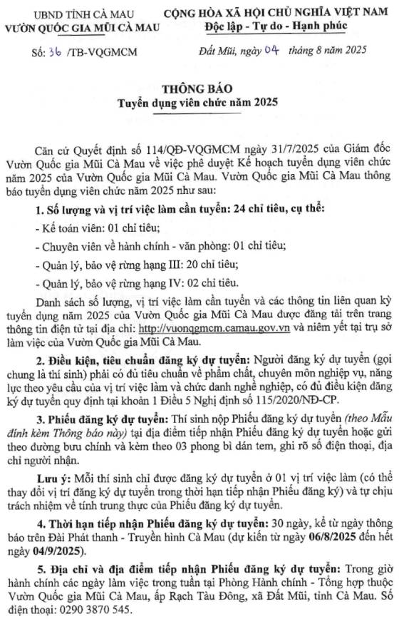Căn cứ Quyết định số 114/QĐ-VQGMCM ngày 31/7/2025 của Giám đốc Vườn Quốc gia Mũi Cà Mau về việc phê duyệt Kế hoạch tuyển dụng viên chức năm 2025 của Vườn Quốc gia Mũi Cà Mau. Vườn Quốc gia Mũi Cà Mau thông báo tuyển dụng viên chức năm 2025 như sau: