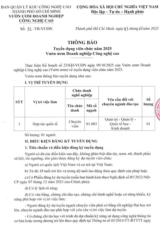 Thực hiện Kế hoạch số 23/KH-VUDN ngày 09/10/2025 của Vườn ươm Doanh nghiệp Công nghệ cao (Vườn ươm) về tuyển dụng viên chức năm 2025. Vườn ươm thông báo tuyển dụng như sau: